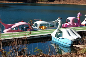 After that burst of splendor we got on to route 409 and headed up into the hills to check out Lake Shibireko. We're always looking for camping ideas and this place was touted as a good place to camp in the on-season. It's a beautiful little lake set within a heavily forested basin. And it has SWAN BOATS for rent; just like the one my main man Paul and I paddled out on Lake Ashi (Hakone) in, to deep six my dad's ashes. You find these ultra cheesy paddle boats on just about every 'resort lake' in Japan; leftovers of the booming bubble days of the 80's. They also have cabins for rent if that's your cup of green tea.